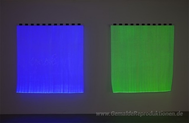 Wir bieten Ihnen eine handgefertigte Reproduktion auf Leinwand des berühmten Kunstwerks 'Foto-Souvenir: Monochrome électrique - Bleu Vert B2 & B3, travai' von Daniel Buren, aus dem Reproduktionsmuseum.