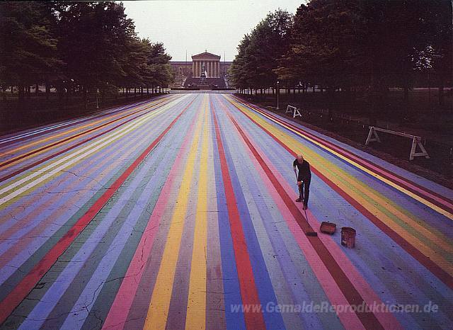Wir bieten Ihnen eine handgefertigte Reproduktion auf Leinwand des berühmten Kunstwerks 'Franklins Fußweg' von Gene Davis, aus dem Reproduktionsmuseum.