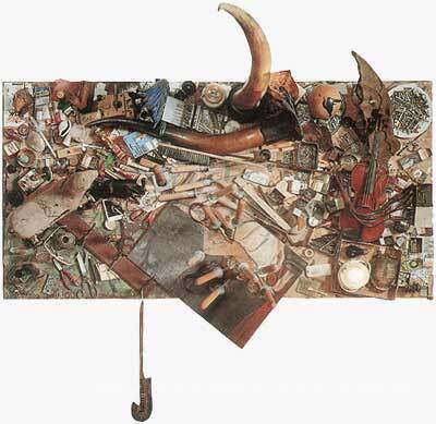 Wir bieten Ihnen eine handgefertigte Reproduktion auf Leinwand des berühmten Kunstwerks 'Großer Arbeitstisch (Marcel Duchamp remis en place)' von Daniel Spoerri, aus dem Reproduktionsmuseum.