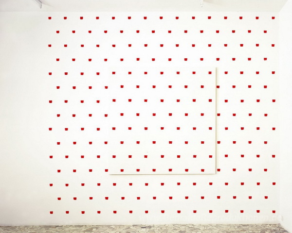 Wir bieten Ihnen eine handgefertigte Reproduktion auf Leinwand des berühmten Kunstwerks 'Imprints eines No. 50 Paintbrush in regelmäßigen Abständen von 3' von Niele Toroni, aus dem Reproduktionsmuseum.