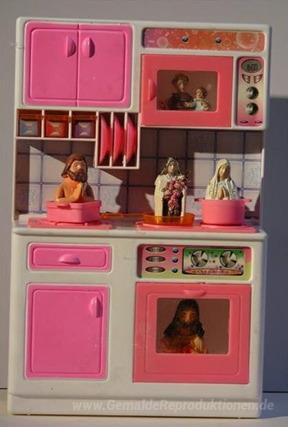 Wir bieten Ihnen eine handgefertigte Reproduktion auf Leinwand des berühmten Kunstwerks 'Küche (Religiöse Figuren)' von Leon Ferrari, aus dem Reproduktionsmuseum.