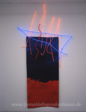 Wir bieten Ihnen eine handgefertigte Reproduktion auf Leinwand des berühmten Kunstwerks 'Mani Sky' von Stephen Antonakos, aus dem Reproduktionsmuseum.