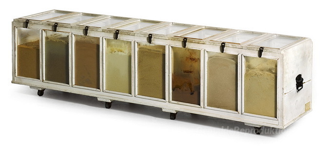Wir bieten Ihnen eine handgefertigte Reproduktion auf Leinwand des berühmten Kunstwerks 'Roth Gewuerztruhe' von Dieter Roth, aus dem Reproduktionsmuseum.