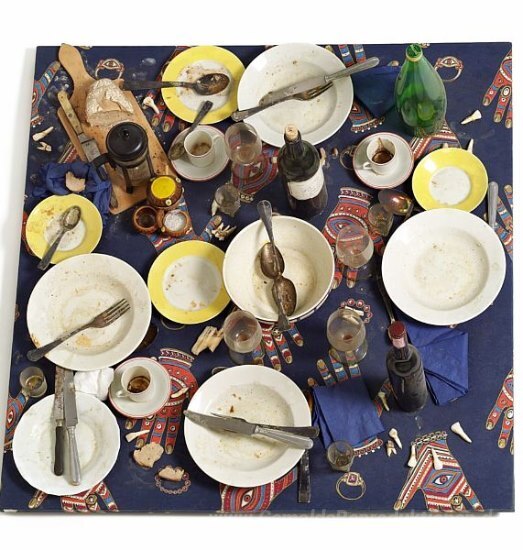 Wir bieten Ihnen eine handgefertigte Reproduktion auf Leinwand des berühmten Kunstwerks 'Tableau piège nach Sevilla' von Daniel Spoerri, aus dem Reproduktionsmuseum.