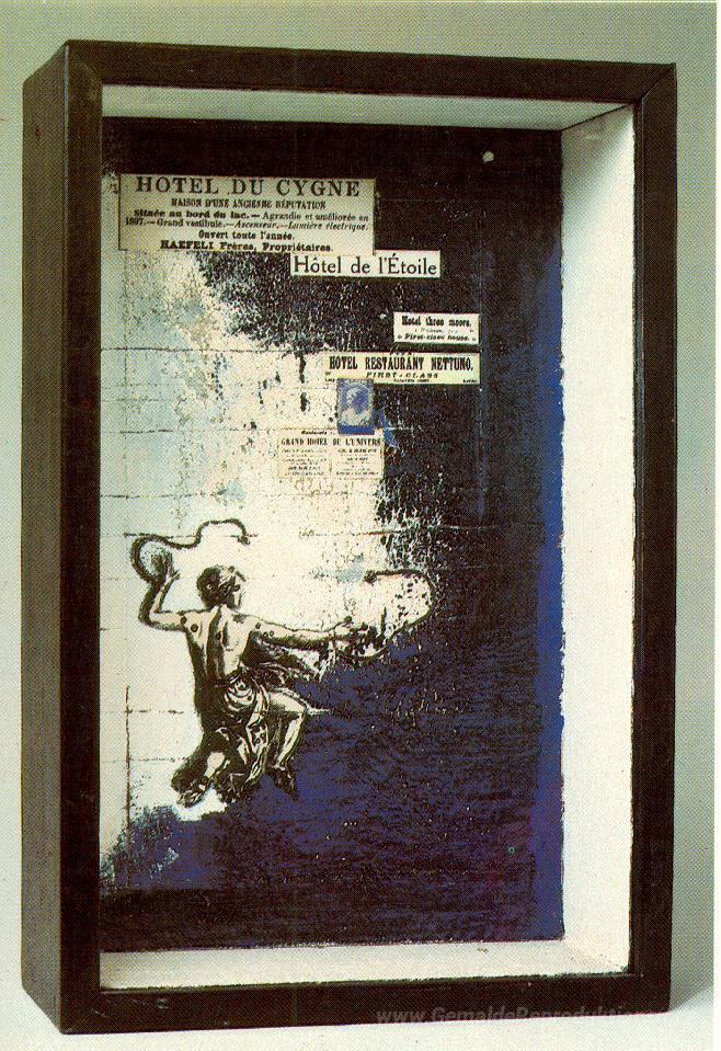 Die Verwendung von Ölfarben verleiht den Gemälden eine brillante Tiefe und Lebendigkeit, die jeden Raum auf einzigartige Weise bereichert. Der unverwechselbare Stil von Joseph Cornell kombiniert verschiedene künstlerische Techniken, die eine außergewöhnliche Atmosphäre schaffen und Langeweile vertreiben. Mit einem-Akzent wie dem Untitled (Hotel du Cygne) können Sie Ihre Wohnräume nicht nur verschönern, sondern auch eine inspirierende Umgebung schaffen, die zum Verweilen einlädt.
