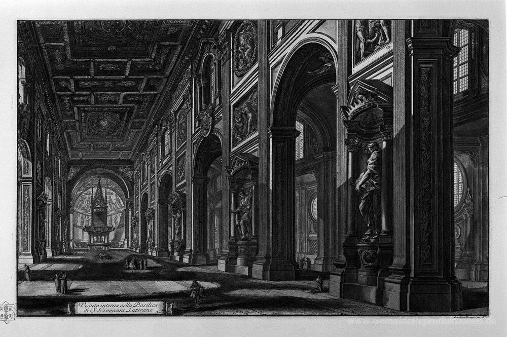 Wir bieten Ihnen eine handgefertigte Reproduktion auf Leinwand des berühmten Kunstwerks 'Ägyptischer Obelisk auf der Plaza San Giovanni in Laterano' von Giovanni Battista Piranesi, aus dem Reproduktionsmuseum.