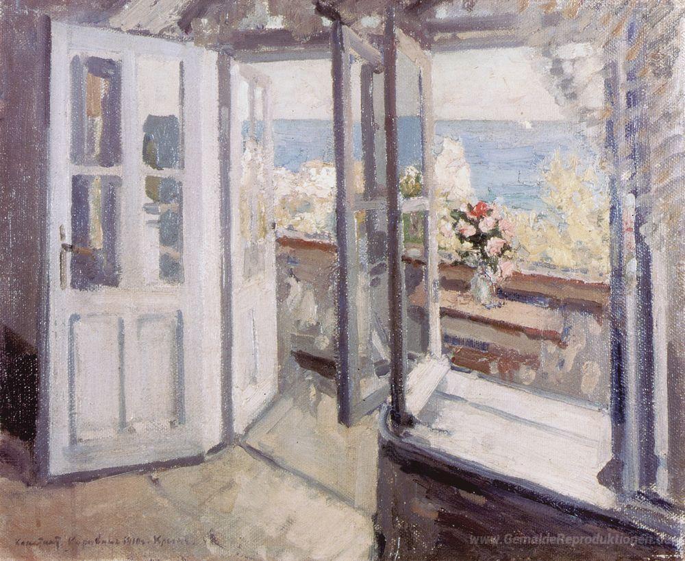 Wir bieten Ihnen eine handgefertigte Reproduktion auf Leinwand des berühmten Kunstwerks 'Balkon auf der Krim' von Konstantin Korovin, aus dem Reproduktionsmuseum.
