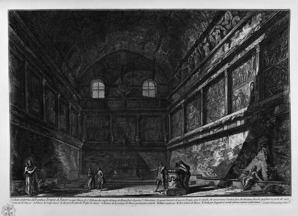 Wir bieten Ihnen eine handgefertigte Reproduktion auf Leinwand des berühmten Kunstwerks 'Blick auf den Tempel des Bacchus, jetzt in der Kirche von St. Ur' von Giovanni Battista Piranesi, aus dem Reproduktionsmuseum.