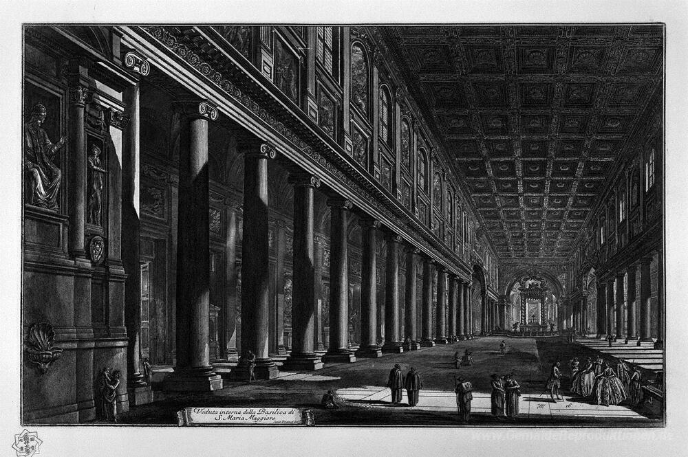 Wir bieten Ihnen eine handgefertigte Reproduktion auf Leinwand des berühmten Kunstwerks 'Blick auf die Basilika von St. Maria Maggiore und die zwei Fabri' von Giovanni Battista Piranesi, aus dem Reproduktionsmuseum.