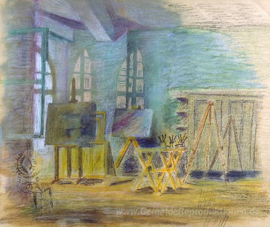 Wir bieten Ihnen eine handgefertigte Reproduktion auf Leinwand des berühmten Kunstwerks 'Das Studio in Hydra' von Nikos Hadjikyriakos-Ghikas, aus dem Reproduktionsmuseum.