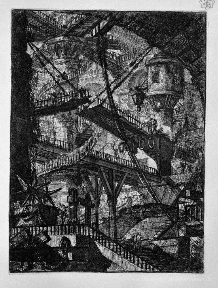 Wir bieten Ihnen eine handgefertigte Reproduktion auf Leinwand des berühmten Kunstwerks 'Die Zugbrücke' von Giovanni Battista Piranesi, aus dem Reproduktionsmuseum.
