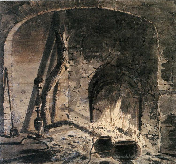 Wir bieten Ihnen eine handgefertigte Reproduktion auf Leinwand des berühmten Kunstwerks 'Ein Open Hearth mit einem Feuer' von Joseph Wright, aus dem Reproduktionsmuseum.