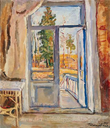 Wir bieten Ihnen eine handgefertigte Reproduktion auf Leinwand des berühmten Kunstwerks 'Feder. Offene Tür auf dem Balkon.' von Pyotr Konchalovsky, aus dem Reproduktionsmuseum.