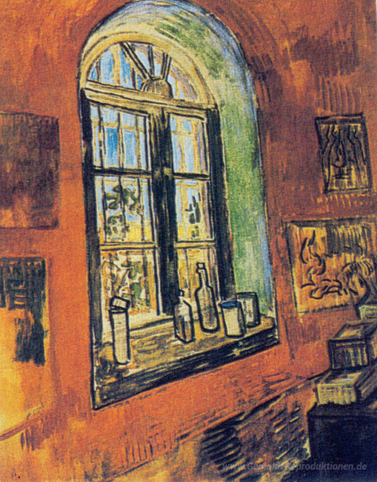 Wir bieten Ihnen eine handgefertigte Reproduktion auf Leinwand des berühmten Kunstwerks 'Fenster von Vincents Studio am Asyl' von Vincent van Gogh, aus dem Reproduktionsmuseum.