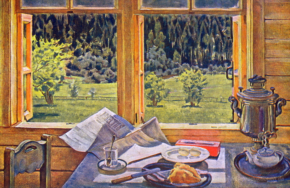Wir bieten Ihnen eine handgefertigte Reproduktion auf Leinwand des berühmten Kunstwerks 'Fenster zur Natur. Ligachevo, kann' von Konstantin Yuon, aus dem Reproduktionsmuseum.