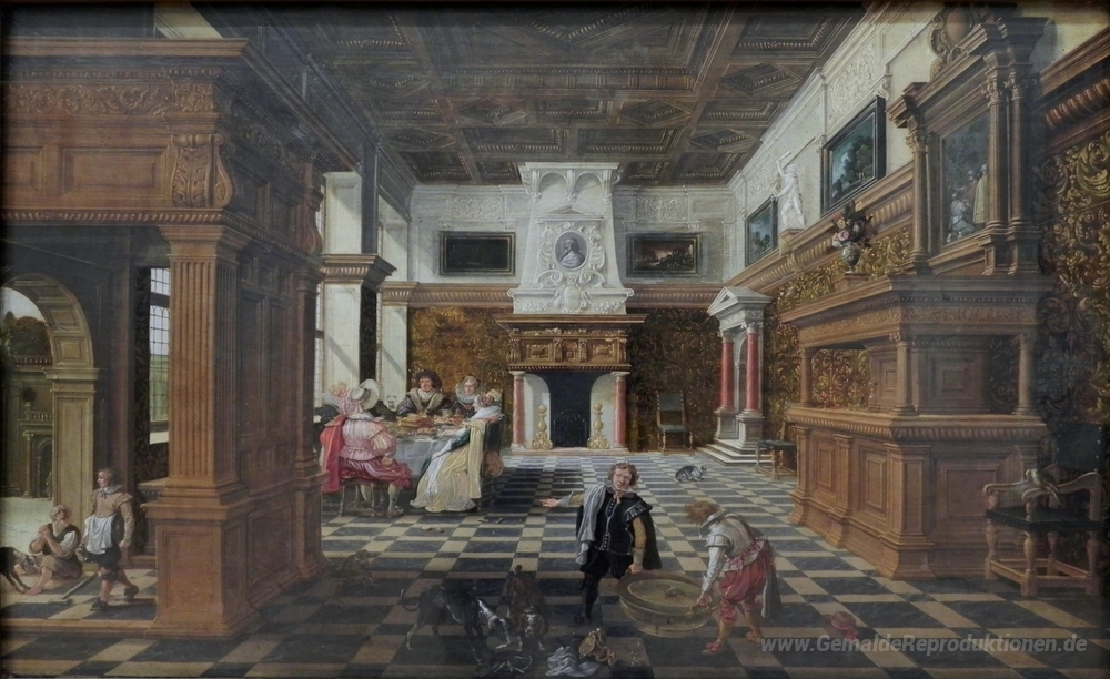 Wir bieten Ihnen eine handgefertigte Reproduktion auf Leinwand des berühmten Kunstwerks 'Halle mit dem Gleichnis von Lazarus und dem reichen Mann (Lukas ' von Esaias van de Velde, aus dem Reproduktionsmuseum.