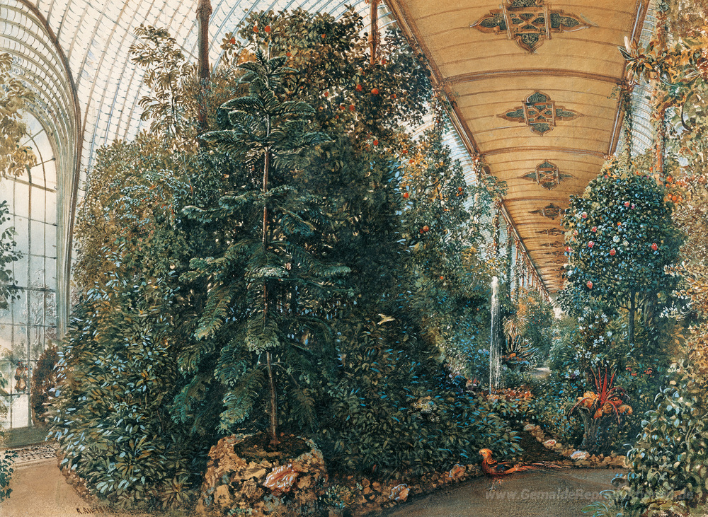 Wir bieten Ihnen eine handgefertigte Reproduktion auf Leinwand des berühmten Kunstwerks 'Innenansicht des Palmenhaus von Schloss Lednice' von Rudolf von Alt, aus dem Reproduktionsmuseum.