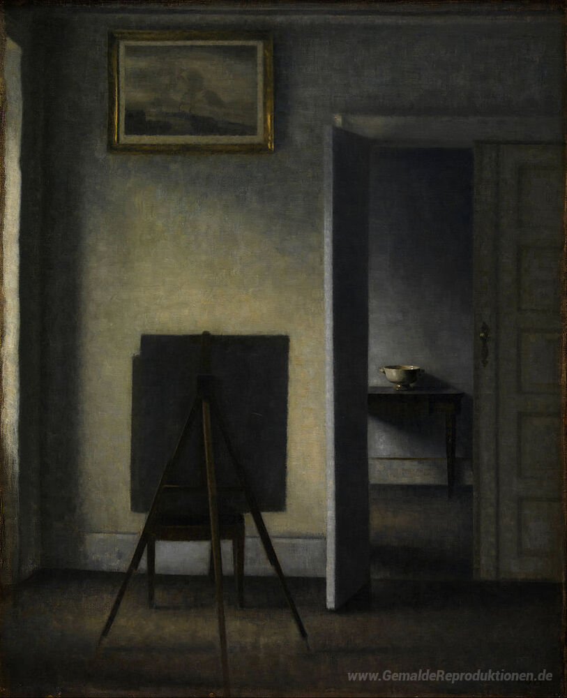 Wir bieten Ihnen eine handgefertigte Reproduktion auf Leinwand des berühmten Kunstwerks 'Innenraum mit des Künstlers Staffelei' von Vilhelm Hammershoi, aus dem Reproduktionsmuseum.
