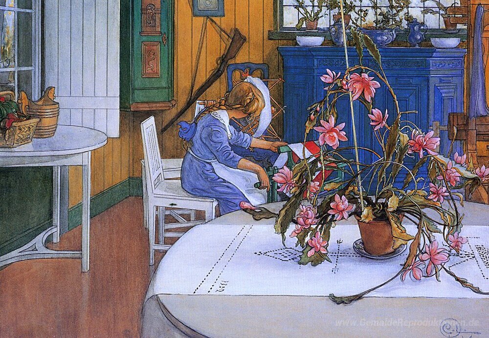 Wir bieten Ihnen eine handgefertigte Reproduktion auf Leinwand des berühmten Kunstwerks 'Innenraum mit einem Kaktus' von Carl Larsson, aus dem Reproduktionsmuseum.