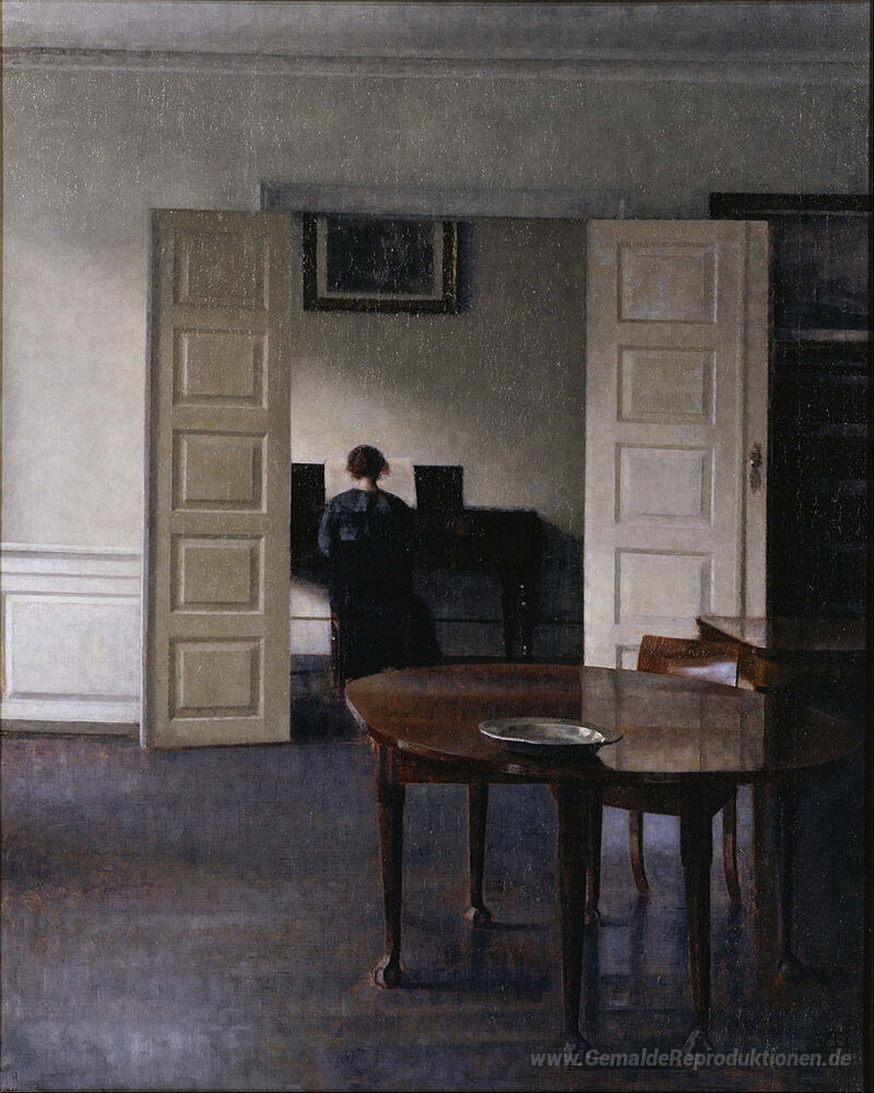 Wir bieten Ihnen eine handgefertigte Reproduktion auf Leinwand des berühmten Kunstwerks 'Innenraum mit Ida Klavierspielen' von Vilhelm Hammershoi, aus dem Reproduktionsmuseum.