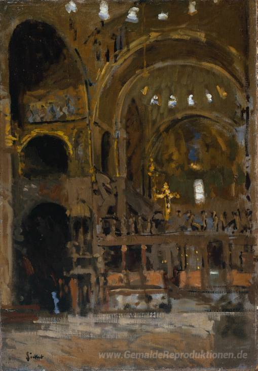 Wir bieten Ihnen eine handgefertigte Reproduktion auf Leinwand des berühmten Kunstwerks 'Interior of St Mark, Venedig' von Walter Sickert, aus dem Reproduktionsmuseum.