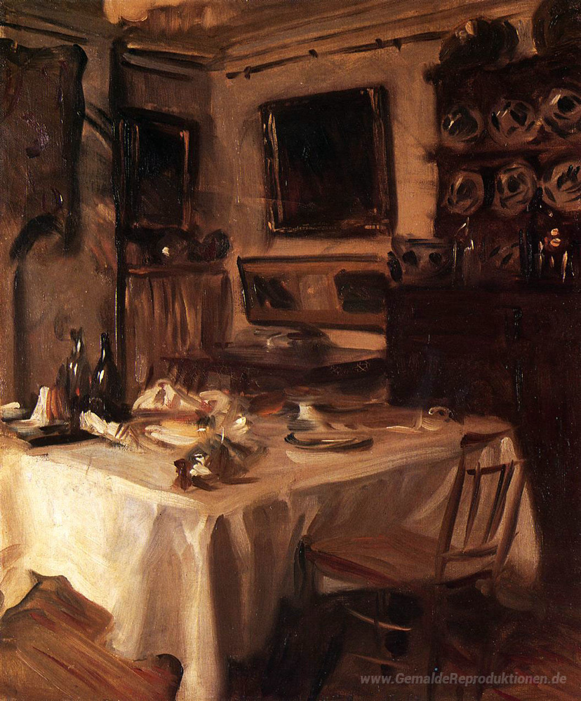 Entdecken Sie die zeitlose Eleganz des Ölgemäldes Meine Dining Room von dem berühmten Künstler John Singer Sargent. Sargent, bekannt für seine meisterhaften Porträts und beeindruckenden Interieurs, kombiniert in diesem Werk außergewöhnliche technische Fähigkeiten mit einem einzigartigen Sinn für Stil. Seine geschickte Anwendung von Licht und Schatten verleiht dem Raum eine lebendige Atmosphäre, die Ihre Sinne anspricht und Ihre Einrichtung aufwertet.