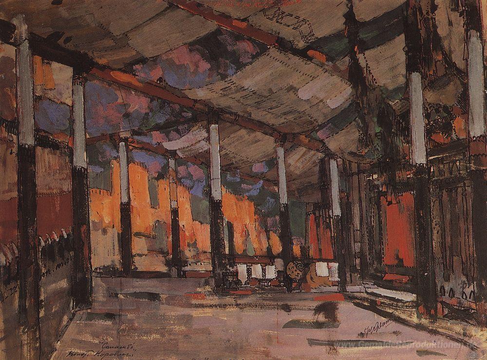 Wir bieten Ihnen eine handgefertigte Reproduktion auf Leinwand des berühmten Kunstwerks 'Militärzelt Mato' von Konstantin Korovin, aus dem Reproduktionsmuseum.