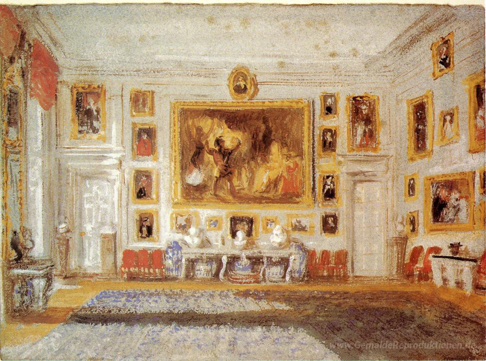 Wir bieten Ihnen eine handgefertigte Reproduktion auf Leinwand des berühmten Kunstwerks 'Petworth, Salon, Occasion Aussenfarbe auf blauem Papier' von William Turner, aus dem Reproduktionsmuseum.
