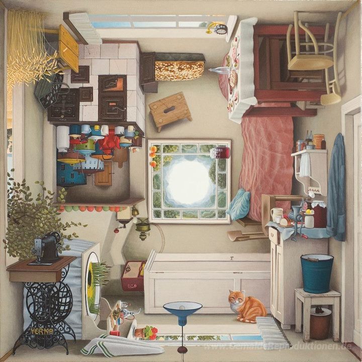 Wir bieten Ihnen eine handgefertigte Reproduktion auf Leinwand des berühmten Kunstwerks 'Polnische Küche' von Jacek Yerka, aus dem Reproduktionsmuseum.