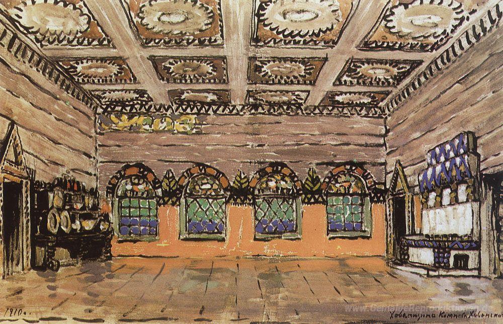 Wir bieten Ihnen eine handgefertigte Reproduktion auf Leinwand des berühmten Kunstwerks 'Refektorium des Hauses Ivan Khovansky' von Konstantin Korovin, aus dem Reproduktionsmuseum.