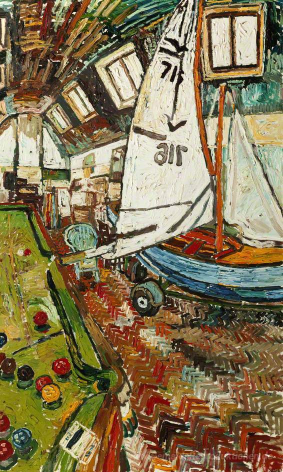 Wir bieten Ihnen eine handgefertigte Reproduktion auf Leinwand des berühmten Kunstwerks 'Segelboot im Studio des Künstlers' von John Bratby, aus dem Reproduktionsmuseum.