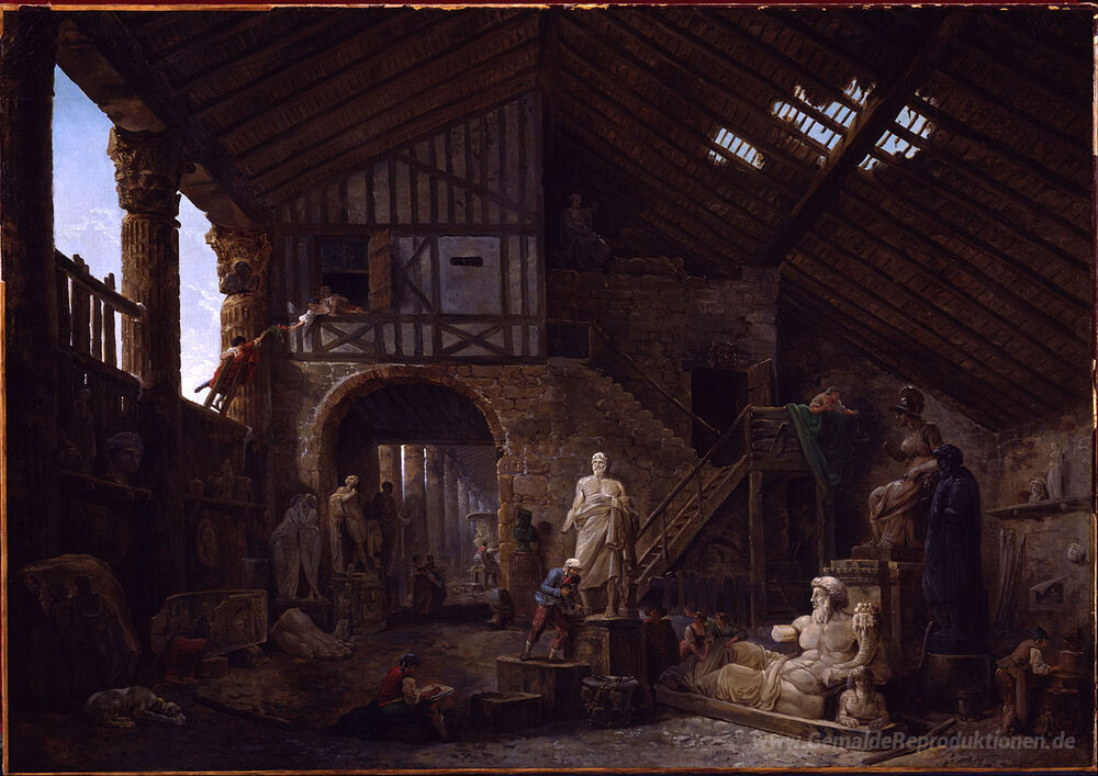 Wir bieten Ihnen eine handgefertigte Reproduktion auf Leinwand des berühmten Kunstwerks 'Studio eines Antiquities Restorer in Rom' von Hubert Robert, aus dem Reproduktionsmuseum.