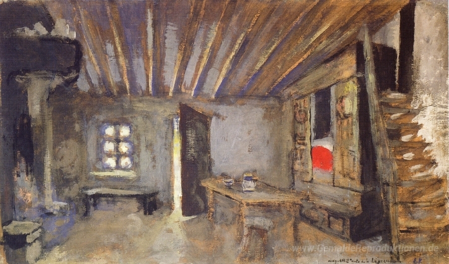 Wir bieten Ihnen eine handgefertigte Reproduktion auf Leinwand des berühmten Kunstwerks 'Studio Interior, Modell für die Landschaft der La Lepreuse' von Edouard Vuillard, aus dem Reproduktionsmuseum.