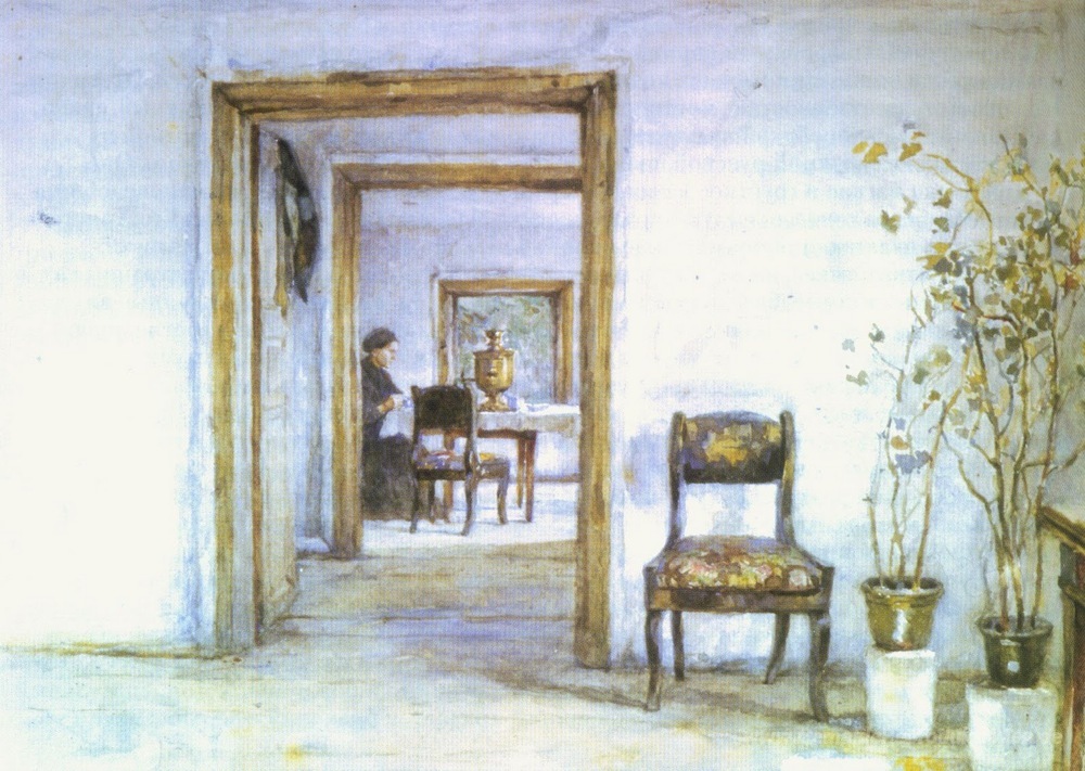 Wir bieten Ihnen eine handgefertigte Reproduktion auf Leinwand des berühmten Kunstwerks 'Zimmer in Surikow Haus' von Vasily Surikov, aus dem Reproduktionsmuseum.