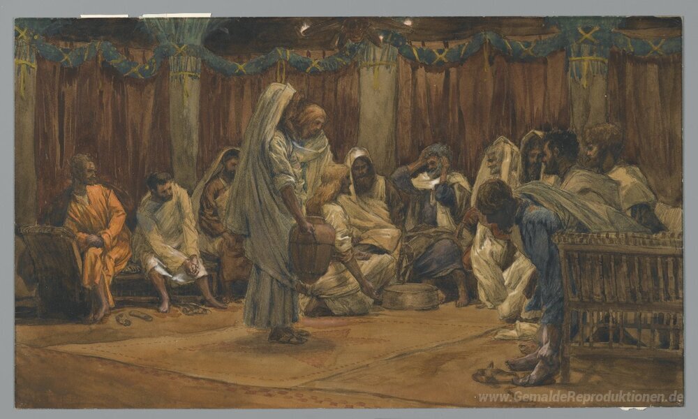 Wir bieten Ihnen eine handgefertigte Reproduktion auf Leinwand des berühmten Kunstwerks 'Die Fußwaschung' von James Tissot, aus dem Reproduktionsmuseum.