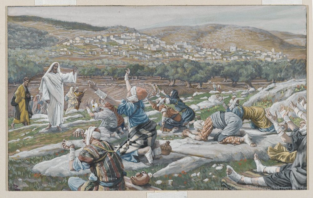 Wir bieten Ihnen eine handgefertigte Reproduktion auf Leinwand des berühmten Kunstwerks 'Die Heilung der zehn Aussätzigen (Guérison de dix lépreux)' von James Tissot, aus dem Reproduktionsmuseum.