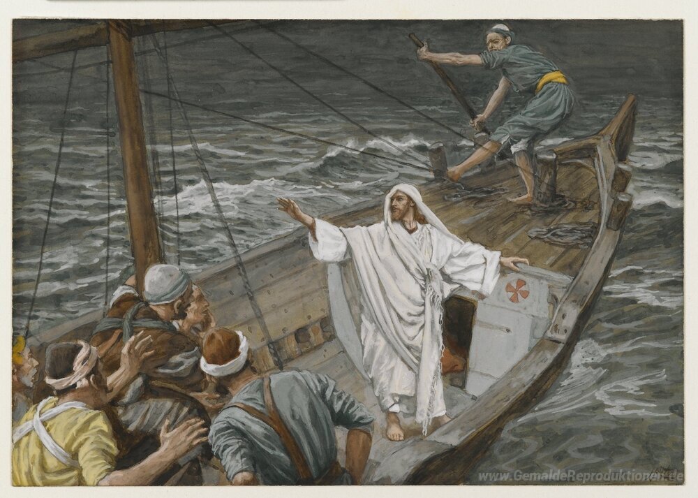 Wir bieten Ihnen eine handgefertigte Reproduktion auf Leinwand des berühmten Kunstwerks 'Jesus Stilling die Tempest' von James Tissot, aus dem Reproduktionsmuseum.