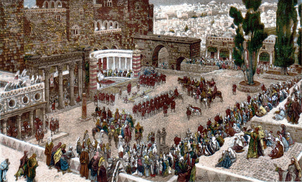 Wir bieten Ihnen eine handgefertigte Reproduktion auf Leinwand des berühmten Kunstwerks 'Pilates Forum' von James Tissot, aus dem Reproduktionsmuseum.