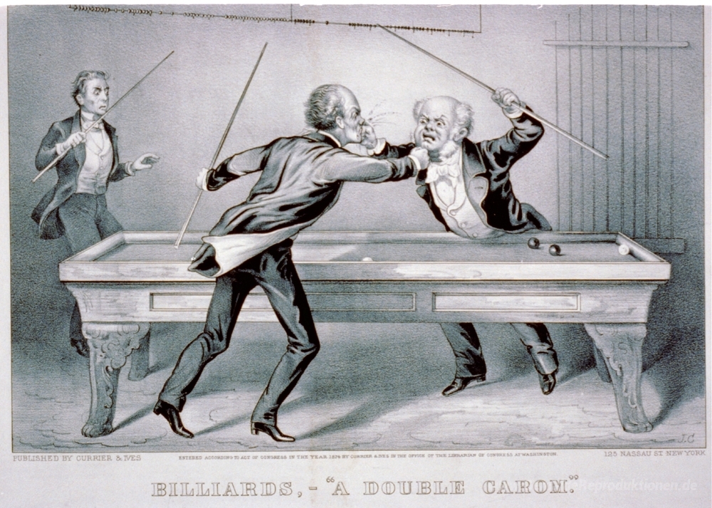 Wir bieten Ihnen eine handgefertigte Reproduktion auf Leinwand des berühmten Kunstwerks 'Billard. Ein Doppel Carom' von Currier and Ives, aus dem Reproduktionsmuseum.