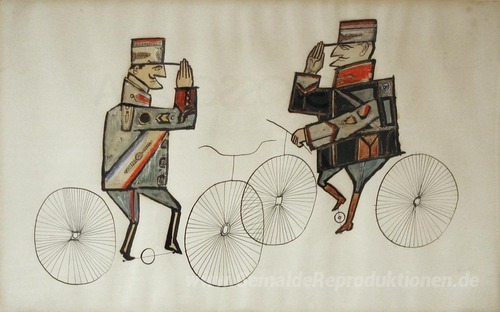 Willkommen in der faszinierenden Welt der Ölgemälde, wo Kunst und Emotion auf einzigartige Weise verschmelzen. Jedes Gemälde erzählt eine eigene Geschichte und bietet eine exklusive Möglichkeit, Ihre Wohnräume zu bereichern. Unter unseren kunstvollen Werken sticht das außergewöhnliche Ölgemälde Zwei Gendarmen des renommierten Künstlers Saul Steinberg hervor. Steinberg, bekannt für seinen unverwechselbaren Stil und seine innovative Technik, schafft mit jedem Pinselstrich eine Atmosphäre, die sowohl zum Nachdenken anregt als auch inspiriert.