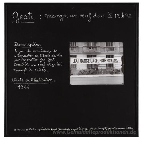 Wir bieten Ihnen eine handgefertigte Reproduktion auf Leinwand des berühmten Kunstwerks 'Geste: Manger un oeuf dur à 12h32' von Ben, aus dem Reproduktionsmuseum.