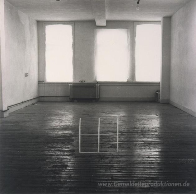 Wir bieten Ihnen eine handgefertigte Reproduktion auf Leinwand des berühmten Kunstwerks 'Perspektivenkorrektur - My Studio II, 3: Quadrat mit Kreuz auf d' von Jan Dibbets, aus dem Reproduktionsmuseum.