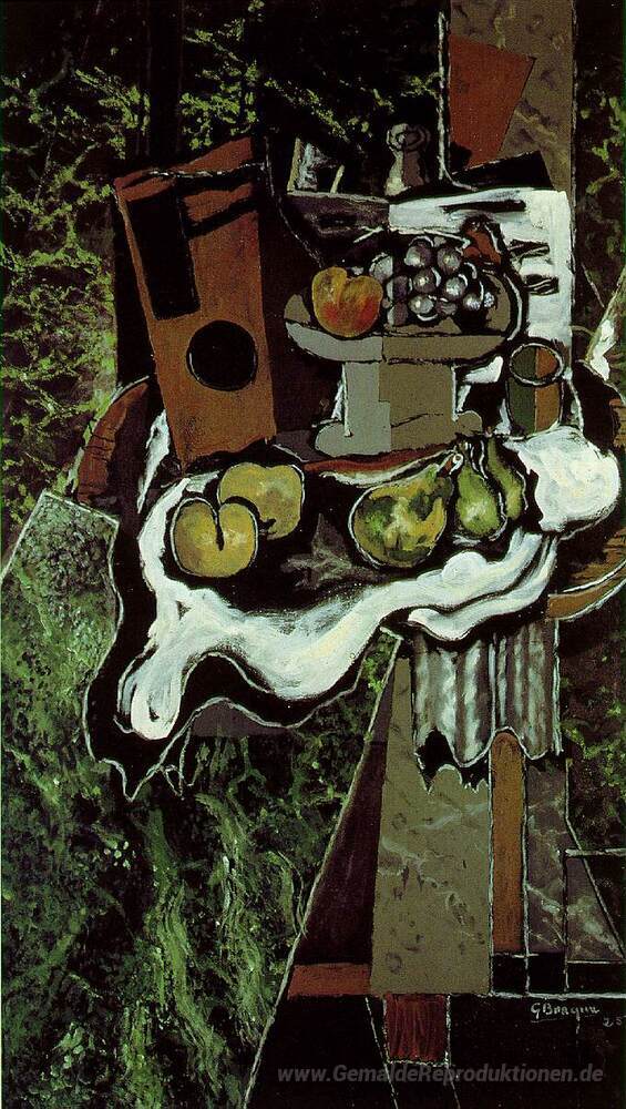 Wir bieten Ihnen eine handgefertigte Reproduktion auf Leinwand des berühmten Kunstwerks 'Obst auf einem Tischtuch mit einem Fruitdish' von Georges Braque, aus dem Reproduktionsmuseum.