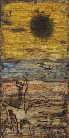 Wir bieten Ihnen eine handgefertigte Reproduktion auf Leinwand des berühmten Kunstwerks 'Ödland' von M.F. Husain, aus dem Reproduktionsmuseum.