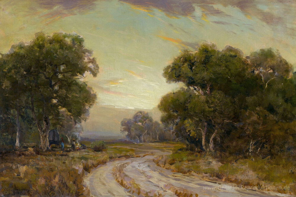 Willkommen in unserer exquisiten Sammlung von Ölgemälden, die nicht nur eine Bereicherung für Ihr Zuhause darstellen, sondern auch Geschichten erzählen. Eines unserer herausragenden Werke ist Abend in der Nähe von Jackson, Southwest Texas, geschaffen von dem talentierten Künstler Robert Julian Onderdonk. Onderdonk, bekannt für seine beeindruckenden Landschaftsdarstellungen, fängt mit meisterhafter Technik die Magie der Natur ein. Seine Werke sind eine Hommage an die amerikanische Wüstenlandschaft und laden den Betrachter ein, in ihre tiefen Farben und lebendigen Texturen einzutauchen.
