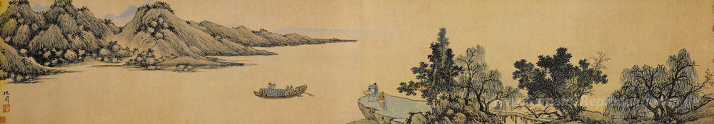 Wir bieten Ihnen eine handgefertigte Reproduktion auf Leinwand des berühmten Kunstwerks 'Abschied an der Jing-Fluss' von Shen Zhou, aus dem Reproduktionsmuseum.