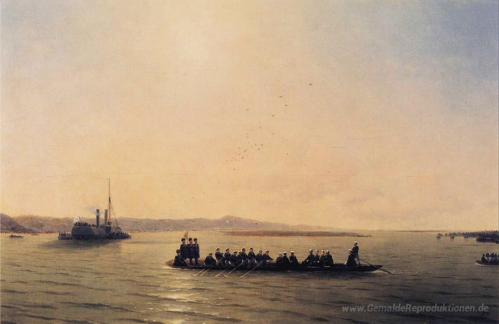Wir bieten Ihnen eine handgefertigte Reproduktion auf Leinwand des berühmten Kunstwerks 'Alexander II über die Donau' von Ivan Aivazovsky, aus dem Reproduktionsmuseum.