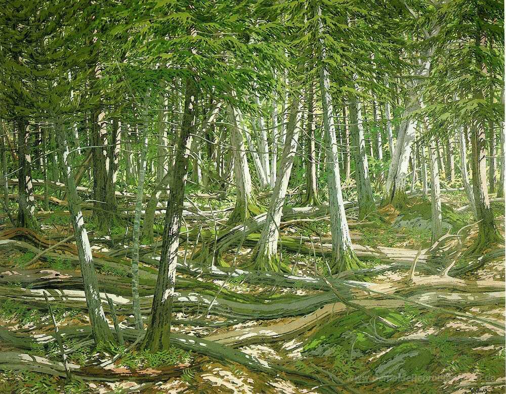 Wir bieten Ihnen eine handgefertigte Reproduktion auf Leinwand des berühmten Kunstwerks 'Alte Windfall' von Neil Welliver, aus dem Reproduktionsmuseum.