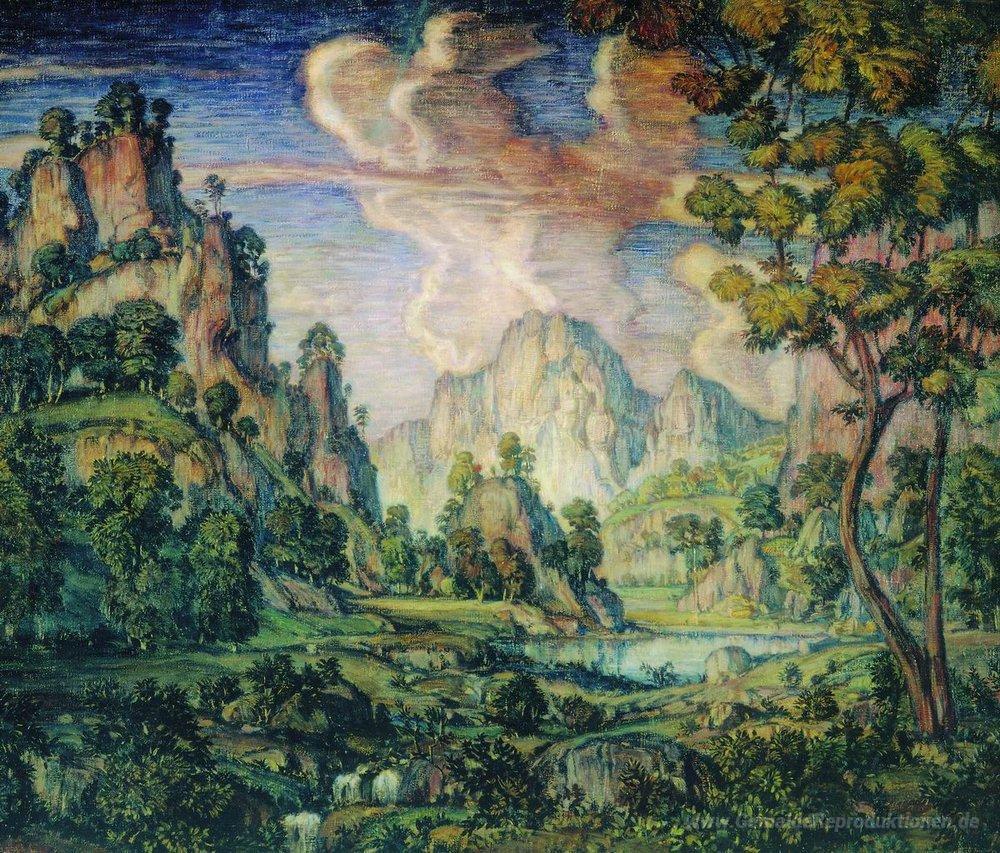 Wir bieten Ihnen eine handgefertigte Reproduktion auf Leinwand des berühmten Kunstwerks 'Altertümliche Landschaft' von Konstantin Bogaevsky, aus dem Reproduktionsmuseum.