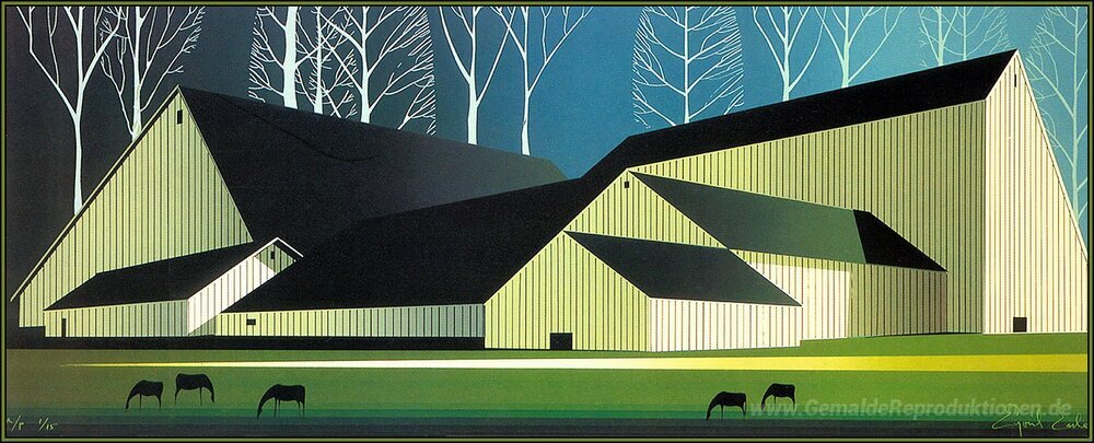 Willkommen bei unserer exklusiven Kollektion von Ölgemälden, die Ihnen ermöglichen, die Schönheit und Eleganz traditioneller Kunst in Ihr Zuhause zu bringen. Jedes Kunstwerk erzählt eine eigene Geschichte und verleiht Ihrem Raum Charakter. Ein herausragendes Beispiel ist das meisterhafte Werk Amerikanische Scheunen von Eyvind Earle. Earle, bekannt für seine lebendigen Farben und einzigartigen Kompositionen, schafft es, die Essenz der amerikanischen Landschaft in seinen Bildern einzufangen.